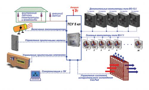 | Тиристорная станция управления микроклиматом ТСУ5 предназначена для плавного регулирования скорости вращения трехфазных асинхронных электродвигателей вытяжных вентиляторов с целью автоматического поддержания температуры воздуха в животноводческих, сельскохозяйственных и других помещениях. В ТСУ5 предусмотрены следующие возможности: - автоматический и ручной режимы работы;